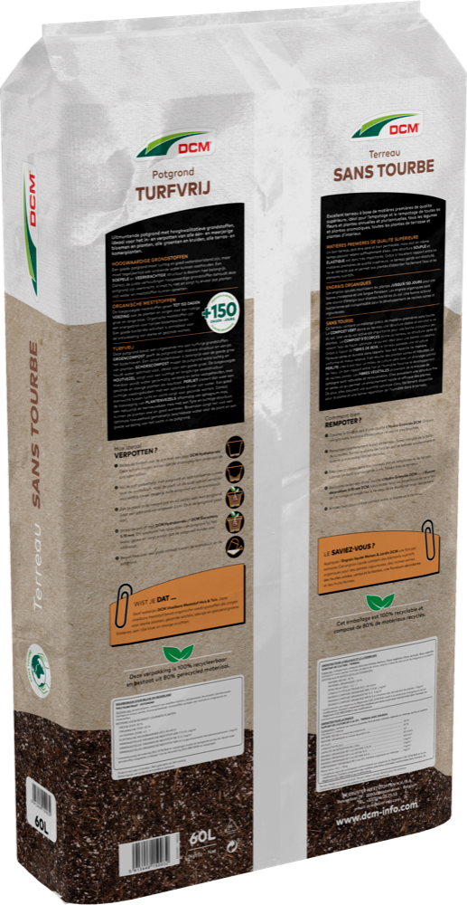 De potgrond bevat een uitgekiende mix aan turfvrije grondstoffen en bezorgt de planten organische voeding tot 150 dagen.