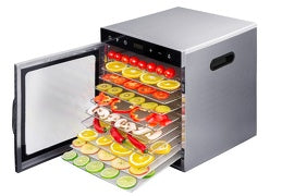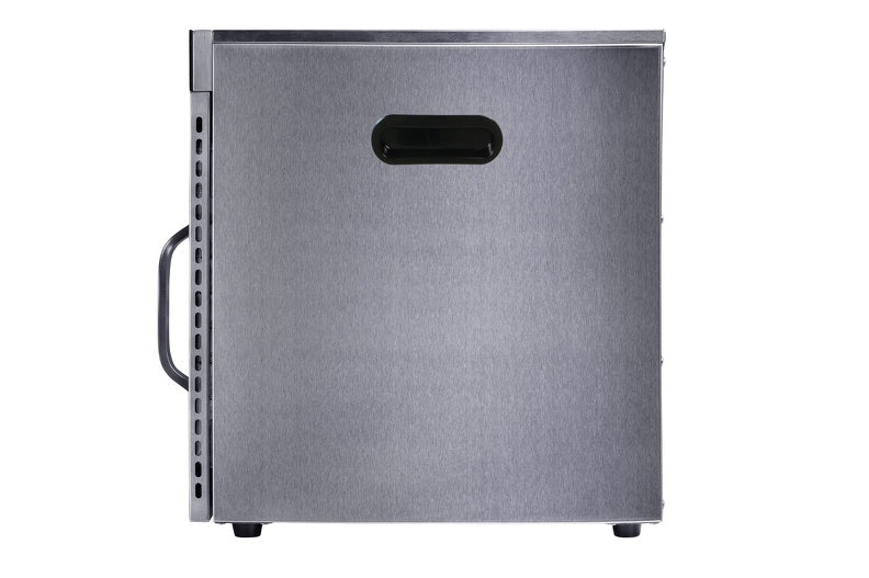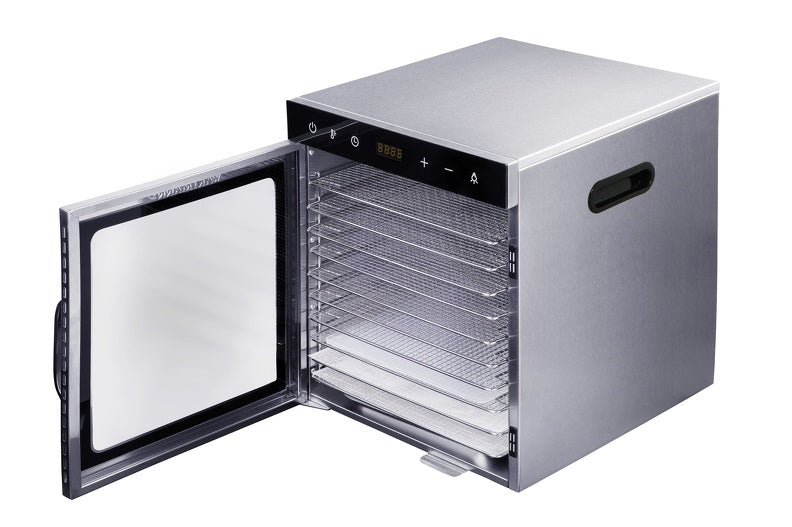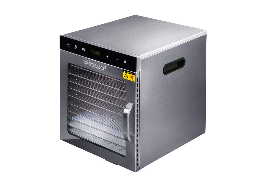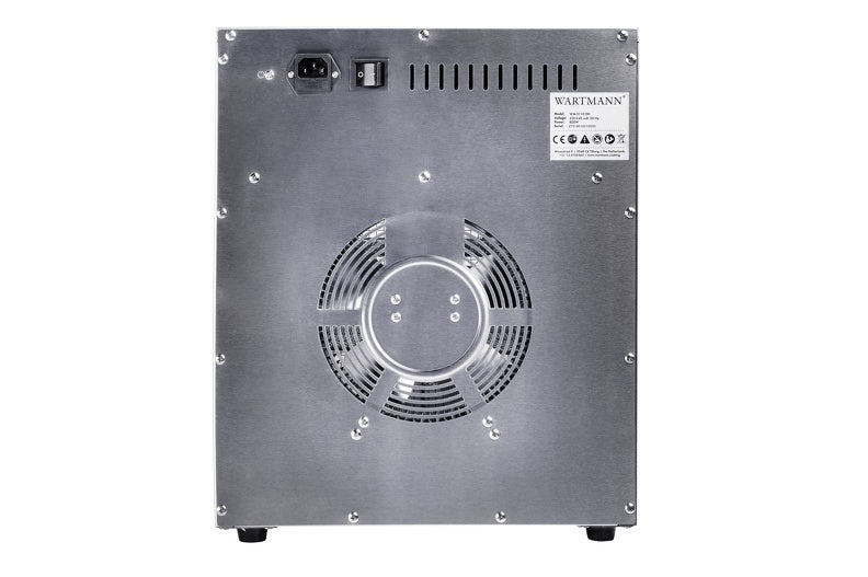 De Wartmann® 10-laags voedseldroger heeft een stevige roestvrijstalen behuizing met raamdeur en is geschikt voor het drogen van 10 kilogram voedsel. De Wartmann® 10-laags voedseldroger droogt horizontaal over de laden. De ventilator zit aan de achterzijde van de voedseldroger waardoor alle laden gelijkmatig gedroogd worden.