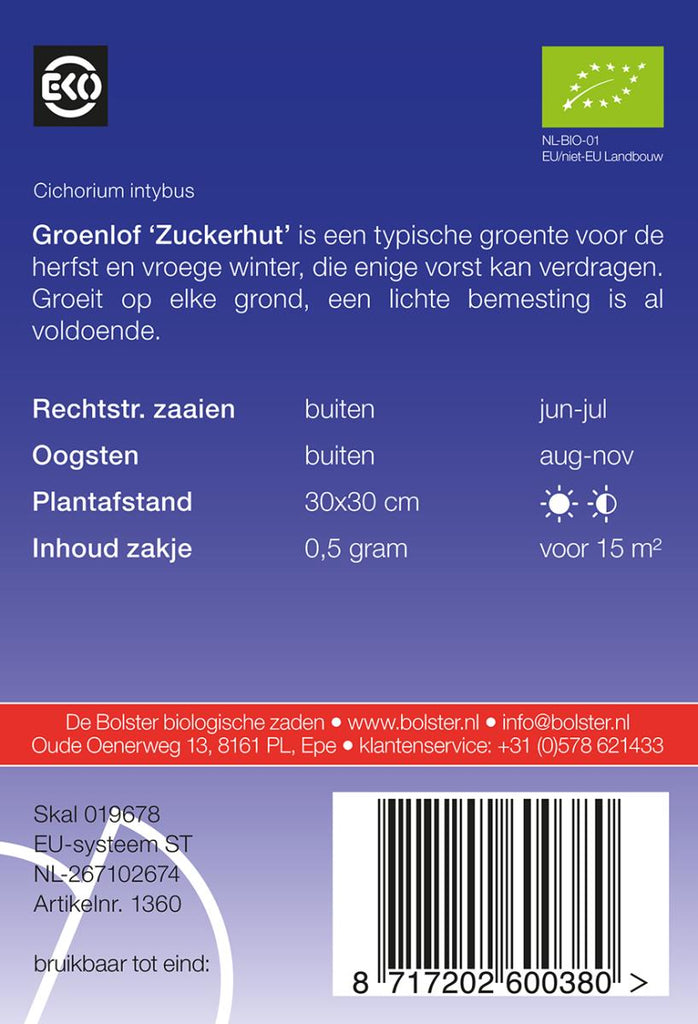 Groenlof 'Zuckerhut' groeit op elke licht bemeste grond. Groenlof kan een beetje vorst verdragen en is daarom een groente voor de herfst of vroege winter. Bij voorkeur rechtstreeks zaaien tussen juni en half juli. Eén zakje is voor circa 15m2, en de plantafstand bedraagt 30x30 cm.