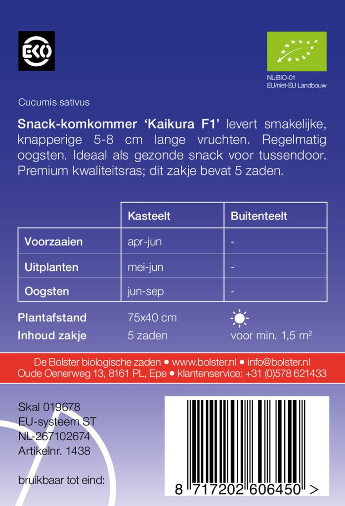 Snack-komkommer 'Kaikura F1' is door zijn formaat knapperig, smakelijk en ideaal om als snack mee te nemen naar werk of school. Het ras is vooral geschikt voor een onverwarmde kas en kan het hele seizoen door geteeld worden. Eén zakje is voor circa 1,5 m2.
