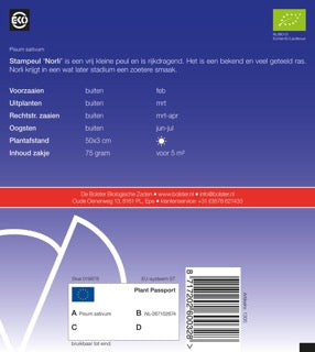 De vrij kleine stampeul 'Norli' heeft geen ondersteuning van gaas nodig. Dit bekende en rijkdragende ras wordt veel geteeld en krijgt in een later stadium een iets zoetere smaak. Eén zakje is voor circa 5m2, en de plantafstand bedraagt 50x5 cm.