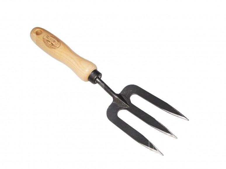 Handgesmeed zuiver gehard klein stalen De Wit handvorkje. Gemakkelijk om grond los te maken. Ook voor klein spit- of rooiwerk kunt u dit vorkje gebruiken. Met essen houten handvat 140mm.