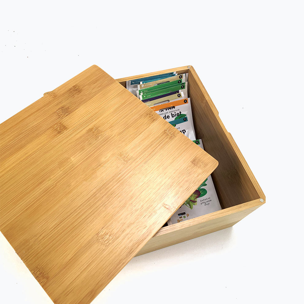 Zakjes zaden kunnen rechtop in het kistje staan.