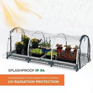 De “Jumbo” kweekbak is een stevige constructie die ondanks zijn royale afmetingen extreem stabiel is. Het 50 cm lange “Jumbo-opzetstuk” beschermt op efficiënte wijze exotische en dure planten in de winter. De geventileerde afzuigkap slaat de meeste warmte op, vermindert condensatie en ondersteunt een gezonde groei.