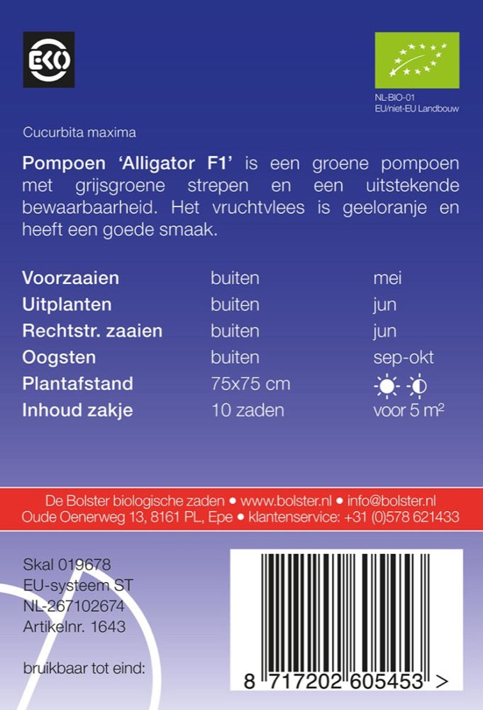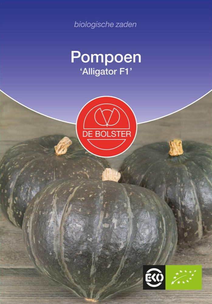 De groene pompoen 'Alligator F1' geeft vruchtvlees van een geeloranje kleur. Deze groene pompoen heeft grijsgroene strepen en wordt gekenmerkt door een uitstekende houdbaarheid. Eén zakje is voor circa 5m2, en de plantafstand bedraagt 75x75 cm