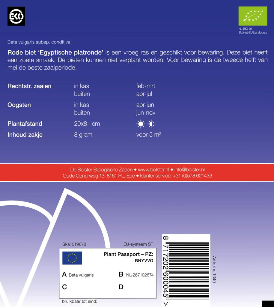De vrij zoete rode biet 'Egyptische platronde' is uiterst geschikt voor bewaring. Het is een vroeg ras. Vanaf half mei is het de beste periode om dit ras te zaaien. Let wel, deze bieten kan men niet verplanten. Eén zakje is voor circa 5 m2, en de plantafstand bedraagt 20x8 cm.