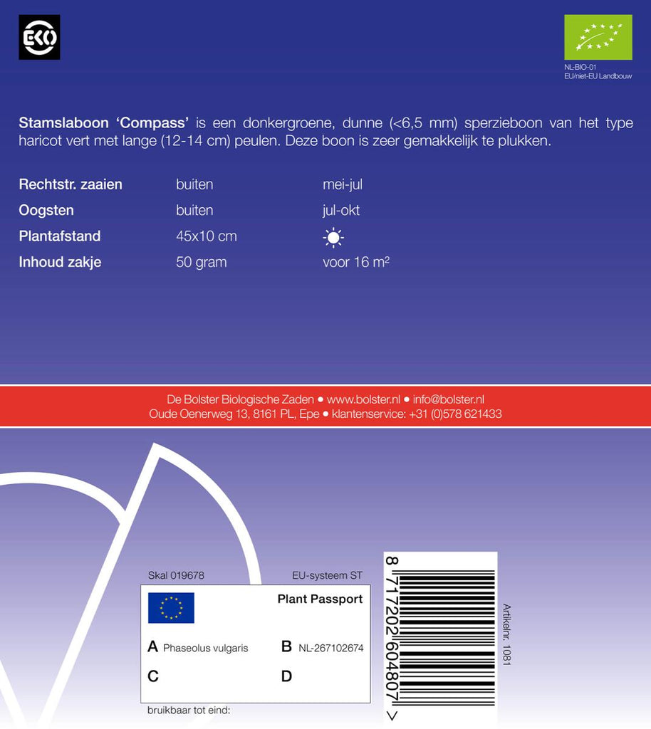Stamslaboon ‘Compass’ is een donkergroene, dunne (6,5 mm) sperzieboon van het type haricot vert met lange (12-14 cm) peulen. Deze boon is zeer gemakkelijk te plukken. Gewaslengte is ca. 50 cm. Zeer makkelijk te plukken.