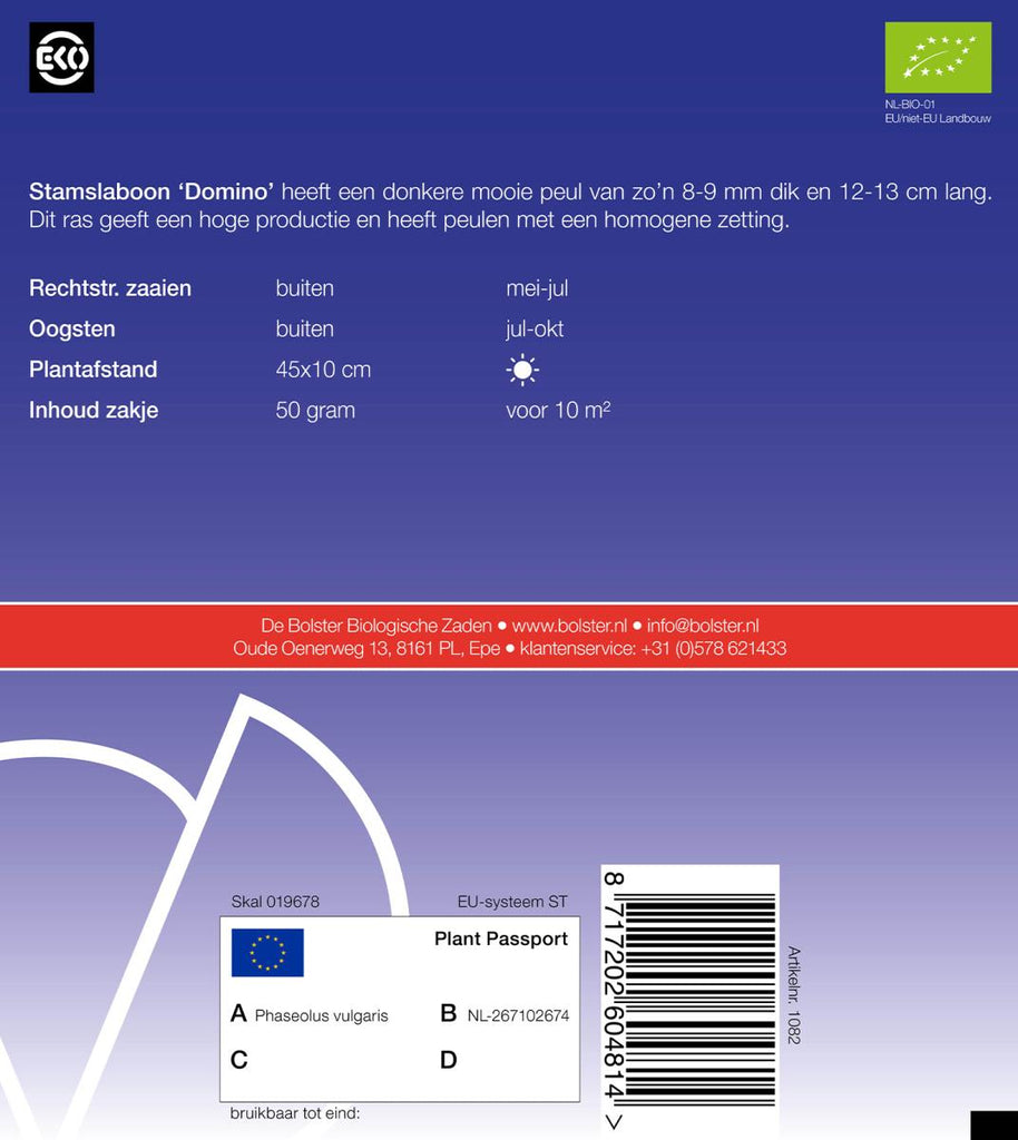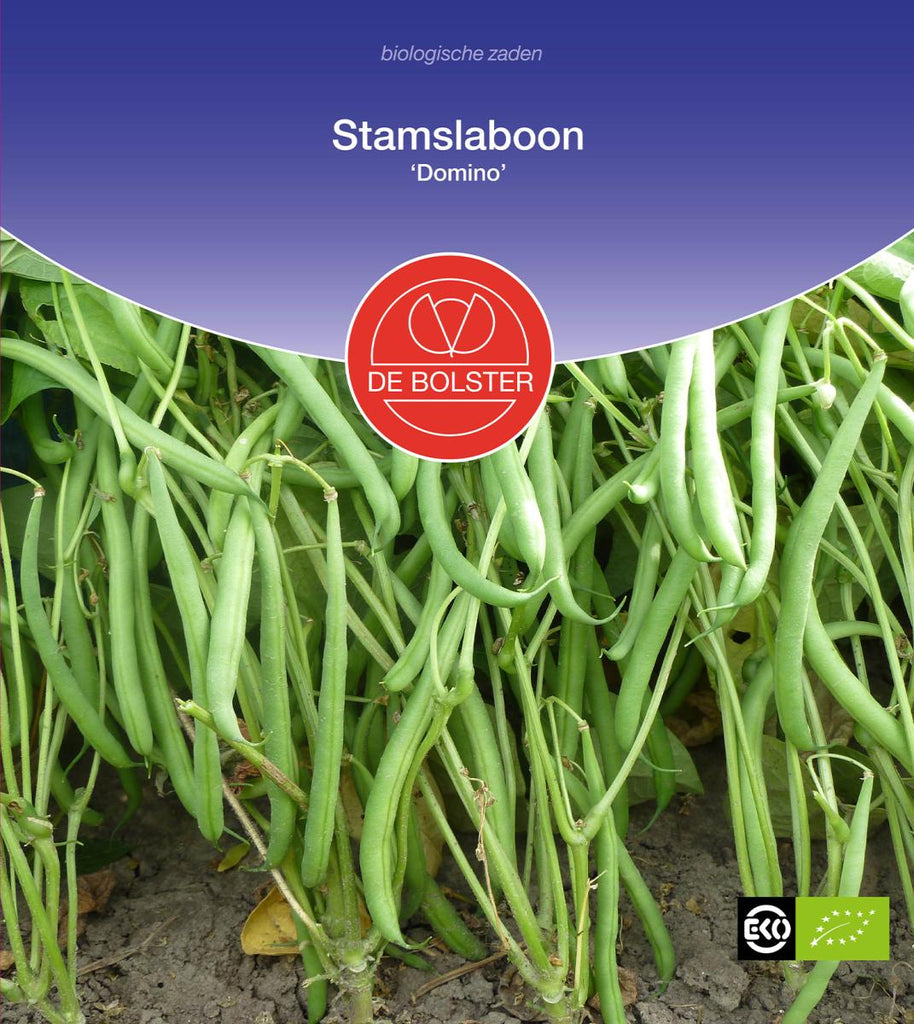 'Domino' is een stamslaboon met een mooie donkere peul. De plant is zo'n 50 cm hoogte en brengt hoge opbrengsten. De peulen hebben een homogene zetting en een mooie lengte-dikte verhouding. Eén zakje is voor circa 10m2, en de plantafstand bedraagt 45x10 cm.